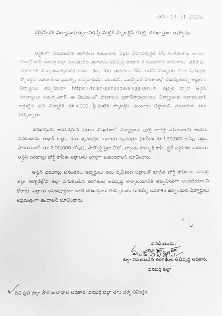 ఆర్థికంగా వెనుకబడిన తరగతుల కుటుంబాల పిల్లల విద్యాభివృద్ధికి బీసీ సంక్షేమశాఖ అండగా నిలుస్తోందని వనపర్తి జిల్లా వెనుకబడిన తరగతుల అభివృద్ధి అధికారి శ్రీ ముజాహిద్ ఖాన్ గారు తెలిపారు. 2025-26 విద్యాసంవత్సరానికి గాను 9వ, 10వ తరగతుల బీసీ, ఈబీసీ విద్యార్థుల కోసం ప్రీ-మెట్రిక్ స్కాలర్షిప్ పథకం కింద ప్రభుత్వ, జడ్పిహెచ్ఎస్, ఎయిడెడ్, మున్సిపల్ పాఠశాలల్లో చదువుతున్న అర్హులైన విద్యార్థులు తప్పనిసరిగా https://telan-ganaepass.cgg.gov.in వెబ్సైట్ ద్వారా ఆన్లైన్ దరఖాస్తులు సమర్పించాలి. ఈ విషయంలో పాటశాలల ప్రధానోపాధ్యయులు, విద్యార్థులకు సహకరించాలి అర్హులైన ప్రతి విద్యార్థికి రూ.4,000 ప్రీ-మెట్రిక్ స్కాలర్షిప్ మంజూరు చేస్తామని ముజాహిద్ ఖాన్ పేర్కొన్నారు.