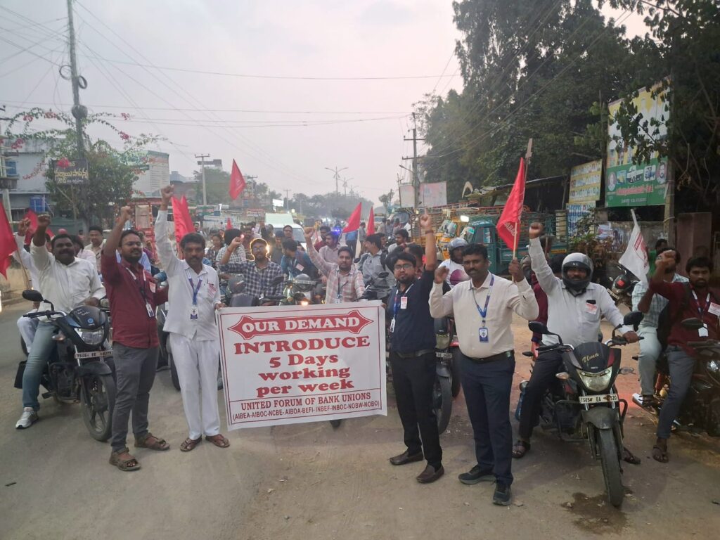 ప్రభుత్వ రంగ బ్యాంకుల్లో వారానికి ఐదు రోజుల పని దినాలను తక్షణమే అమలు చేయాలని కోరుతూ కోదాడలో అన్ని బ్యాంకుల యూనియన్లు పట్టణంలో భారీ బైక్ ర్యాలీ ప్రదర్శన చేపట్టారు. సాయంత్రం స్థానిక స్టేట్ బ్యాంక్ ఆఫ్ ఇండియా (SBI) ప్రధాన శాఖ ఎదుట వివిధ బ్యాంకుల ఉద్యోగులు, సిబ్బంది పెద్ద ఎత్తున నిరసన తెలిపారు. ఈ సందర్భంగా నాయకులు మాట్లాడుతూ ఐదు రోజుల పని దినాల డిమాండ్ ఎప్పటి నుంచో పెండింగ్లో ఉందని, కేంద్ర ప్రభుత్వం దీనిపై మొండి వైఖరి వీడాలని డిమాండ్ చేశారు. అదేవిధంగా బ్యాంకుల్లో సిబ్బంది కొరత తీవ్రంగా ఉందని, దీనివల్ల ఉన్న ఉద్యోగులపై పని ఒత్తిడి విపరీతంగా పెరుగుతోందని ఆవేదన వ్యక్తం చేశారు. ఖాళీగా ఉన్న పోస్టులను వెంటనే భర్తీ చేసి, కొత్త నియామకాలు చేపట్టాలని వారు కేంద్రాన్ని కోరారు. ఈ కార్యక్రమంలో ఈ నిరసన కార్యక్రమంలో మేనేజర్ శివకుమార్, చీఫ్ మేనేజర్ వీరస్వామి, వెంకటరత్నం, ఉమా మహేష్, చిట్టిబాబు, రాము, నందన్ రెడ్డి, సౌజన్య, రమ్య, సాయి వివిధ బ్యాంకుల ప్రతినిధులు, సిబ్బంది పాల్గొన్నారు. పాల్గొన్నారు.
