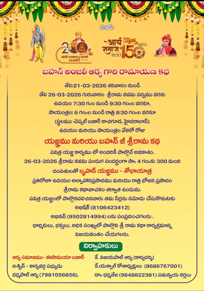 బెహన్ అంజలీ ఆర్య రామాయణ కథ ఆర్య ఈసామి మాబజార్ ఆధ్వర్యంలో 21 వ తారీకు నుండి ప్రారంభం అయిన రామాయణ కథ నాలుగవ రోజు కీ