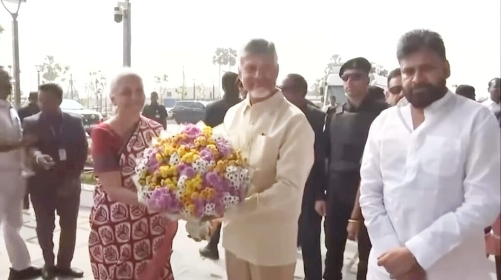 ఆంధ్రప్రదేశ్ రాజధాని అమరావతిలోని సిఆర్డిఏ కార్యాలయం వద్ద 15 బ్యాంకింగ్ మరియు బీమా సంస్థల ప్రధాన కార్యాలయాల నిర్మాణ శంకుస్థాపన కార్యక్రమానికి విచేసిన కేంద్ర ఆర్థిక,కార్పొరేట్ వ్యవహారాల శాఖా మంత్రి శ్రీమతి నిర్మలా సీతారామన్ కి ఘన స్వాగతం పలికిన ముఖ్యమంత్రి నారా చంద్రబాబు నాయుడు ,ఉపముఖ్యమంత్రి .పవన్ కళ్యాణ్ ,పర్యాటక, సాంస్కృతిక మరియు సినిమాటోగ్రఫీ మంత్రి కందుల దుర్గేష్ మరియు సహచర మంత్రులు