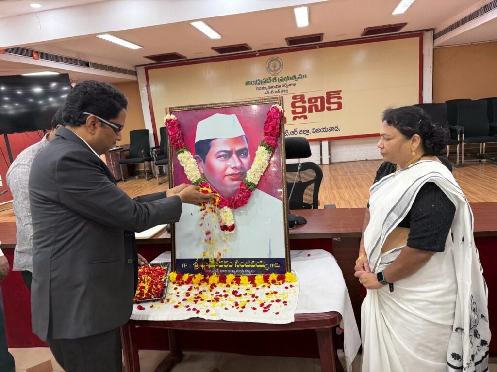 మాజీ ముఖ్యమంత్రి దామోదరం సంజీవయ్య జయంతిని పురస్కరించుకుని శనివారం జిల్లా సాంఘిక సంక్షేమశాఖ ఆధ్వర్యంలో ఎన్టీఆర్ జిల్లా కలెక్టర్ కార్యాలయం శ్రీ పింగళి వెంకయ్య సమావేశ మందిరంలో ఏర్పాటు చేసిన ప్రత్యేక కార్యక్రమంలో జిల్లా కలెక్టర్ లక్ష్మీశ.. డీఆర్వో ఎం. లక్ష్మీనరసింహం, అధికారులతో కలిసి దామోదరం సంజీవయ్య చిత్రపటానికి పూలమాలలు వేసి నివాళులు అర్పించారు. దామోదరం సంజీవయ్య నిరాడంబరత, నిజాయితీ, కార్య దక్షత నేటి తరానికి ఆదర్శంగా నిలుస్తాయన్నారు. కార్యక్రమంలో జిల్లా సాంఘిక సంక్షేమ అధికారి రమాదేవి, కలెక్టరేట్ వివిధ సెక్షన్ల అధికారులు, సహాయ సాంఘిక సంక్షేమ అధికారులు, వసతి గృహ సంక్షేమ అధికారులు తదితరులు పాల్గొన్నారు.