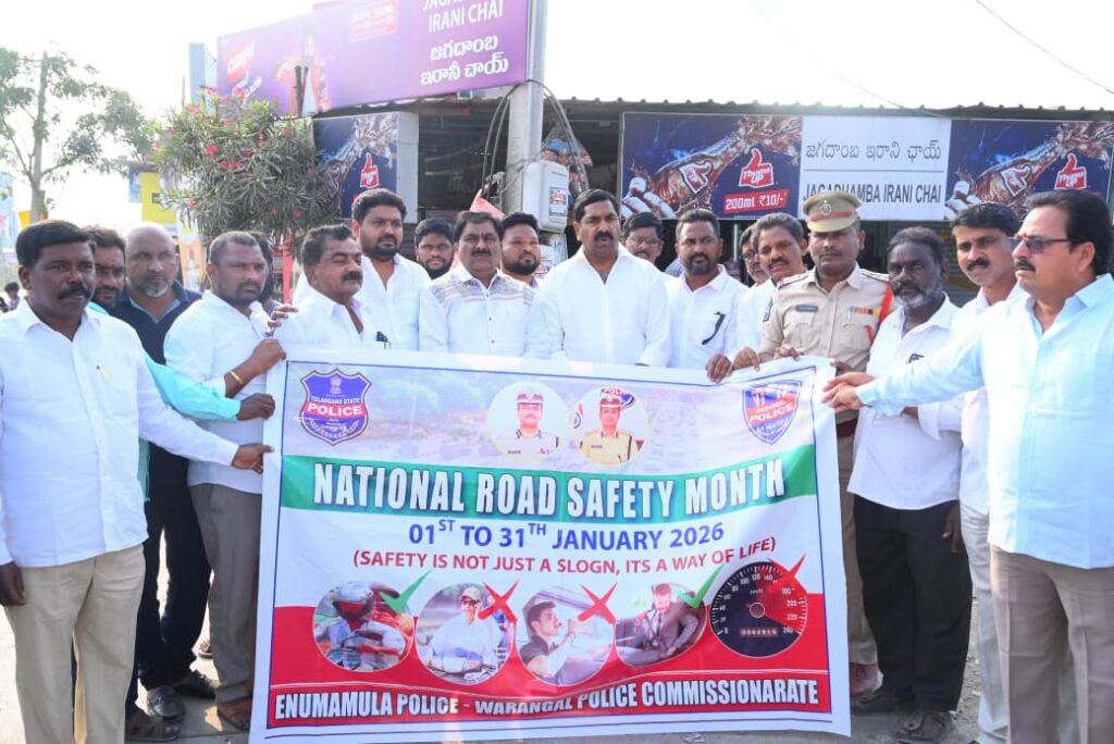 ప్రతి ఒక్కరూ రోడ్డు భద్రత నియమాలను కచ్చితంగా పాటించి రోడ్డు ప్రమాదాల నివారణకు సహకరించాలని వర్ధన్నపేట శాసనసభ్యులు కే.ఆర్. నాగరాజు ప్రజలకు పిలుపునిచ్చారు. జాతీయ రోడ్డు భద్రత మాసోత్సవాల సందర్భంగా గ్రేటర్ వరంగల్ మున్సిపల్ కార్పొరేషన్ పరిధిలోని 14వ డివిజన్ బాలాజీ నగర్ జంక్షన్ వద్ద మంగళవారం రోజున అవగాహన కార్యక్రమం నిర్వహించారు. ఈ కార్యక్రమాన్ని స్థానిక పోలీస్ స్టేషన్ సీఐ జువాజీ సురేష్ ఆధ్వర్యంలో నిర్వహించగా, వర్ధన్నపేట నియోజకవర్గ ఎమ్మెల్యే, విశ్రాంత ఐపీఎస్ అధికారి కే.ఆర్. నాగరాజు ముఖ్య అతిథిగా పాల్గొన్నారు.