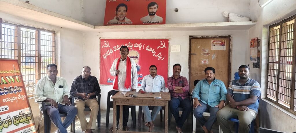 కేంద్ర ప్రభుత్వం అనుసరిస్తున్న కార్మిక కర్షక వ్యతిరేక విధానాలకు వ్యతిరేకంగా ఈనెల 26వ తారీఖున దేశవ్యాప్తంగా జరగబోయే నిరసన కార్యక్రమాన్ని జయప్రదం చేయాలని అఖిలభారత ఐక్య రైతు సంఘం జిల్లా ఉపాధ్యక్షులు కల్లూరి కిషోర్, తెలంగాణ వ్యవసాయ కార్మిక సంఘం జిల్లా సహాయ కార్యదర్శి ముదిగొండ రాంబాబు, తెలంగాణ రైతు సంఘం జిల్లా సహాయ కార్యదర్శి నరాటి రమేష్ పిలుపునిచ్చారు. మండల కేంద్రంలో జరిగిన సంయుక్త కిసాన్ మోర్చా సమావేశంలో మాట్లాడుతూ రైతాంగ సమస్యల మీద దేశవ్యాప్తంగా జరిగిన ఉద్యమం సందర్భంలో కేంద్ర ప్రభుత్వం రైతాంగానికి రాతపూర్వకంగా ఇచ్చిన హామీలను అమలు చేయాలని , ముఖ్యంగా కనీస మద్దతు ధర స్వామినాధన్ సిపార్సులు అమలు గ్యారెంటీ చేయాలని, రైతులకు వ్యవసాయ కార్మికులకు సమగ్ర రుణమాఫీ పథకాన్ని ప్రకటించాలని, ఇప్పటికే రుణగ్రహితులైన రైతులపై చట్ట విరుద్ధ వేధింపులు ఆపి రైతులకు వడ్డీ లేని రుణాన్ని అమలు చేయాలని దీని కోసం ఆర్బిఐ, నాబార్డ్ కి నిధులు కేటాయించాలని కార్మికులకు రక్షణగా ఉన్న కార్మిక చట్టాలను రద్దుచేసి వాటి స్థానంలో నాలుగు లేబర్ కోర్టులను తెచ్చే ఆలోచన కేంద్ర ప్రభుత్వం మానుకోవాలని డిమాండ్ చేశారు. లేని పక్షంలో మళ్ళీ దేశ వ్యాపిత ఉద్యమం ప్రారంభిస్తామని హెచ్చరించారు. ఈ కార్యక్రమంలో తెలంగాణ రైతు సంఘం జిల్లా సహాయ కార్యదర్శి ఊకంటి రవి కుమార్, వ్యవసాయ కార్మిక సంఘం జిల్లా నాయకులు పోతుగంటి లక్ష్మణ్, నకిరేకంటి నాగేశ్వరరావు, అనుమల సాయి పాల్గొన్నారు.